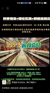 金尔康百都解标准化工具化价值方案科学理论+理论实践+数据呈现之系列反馈 规模23万,海兰褐,单栋46000+路补920只,119日龄,全程按照金尔康百都解标准化工具化价值方案使
