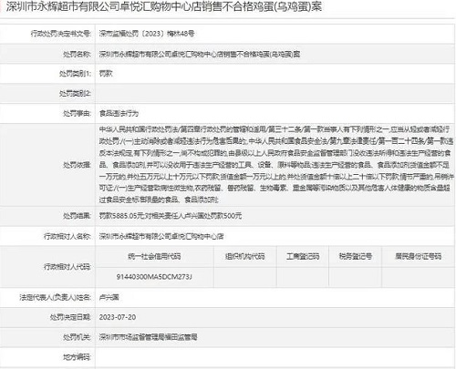 7月24日,深圳市市场监督管理局网站日前公布行政处罚决定书《深圳市永辉超市有限公司卓悦汇购物中心店销售不合格鸡蛋(乌鸡蛋)案》(深市监福处罚〔2023〕梅林48号),深圳市永辉超市有限公司卓悦汇购物中心店存在食品违法行为。